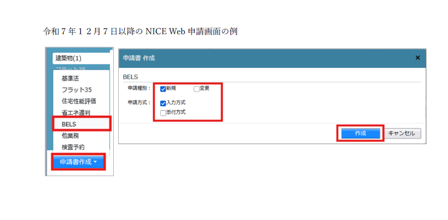12/19のお知らせに掲載しましたとおり、令和8年1月5日よりBELS評価業務においてNICE Web申請システムの入力方式による申請受付を開始いたします。申請受付に先立ちまして、令和7年12月27日よりNICE Web申請システムが下記のとおり変更になります。