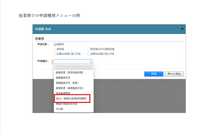(2) [他業務]メニューからBELS新規申請およびBELS変更申請の作成が行えなくなり、BELS評価業務に関しては、